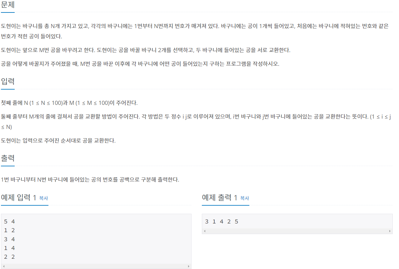 3) 반복 횟수 M번 동안 for loop를 돌면서 바꿀 바구니 i와 j를 입력 받습니다.